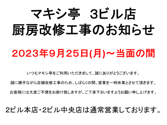 いつも マキシ亭3ビル店 をご利用いただきありがとうございます。
